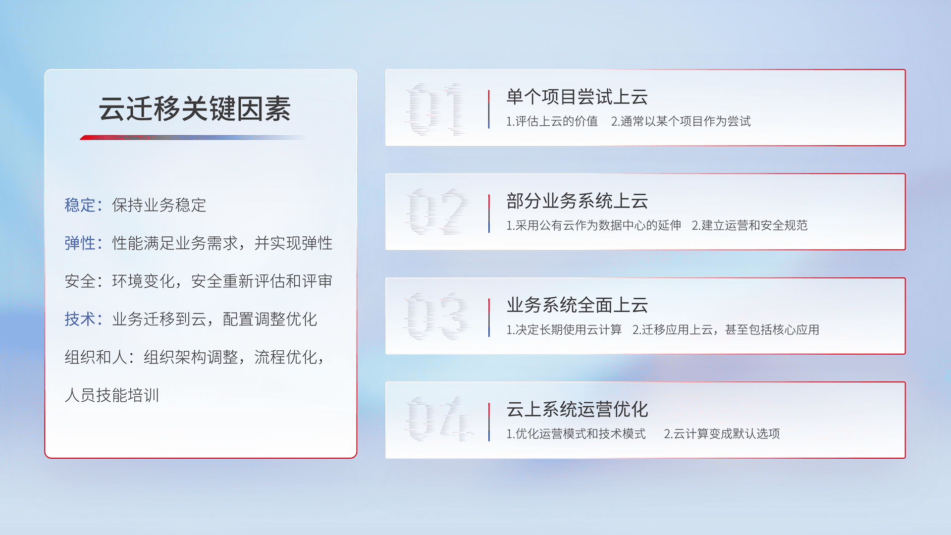 结合实际业务,,,,从规划设计、、、云平台选型、、、、云原生改造、、、、数据迁移、、、集成交付,,,迁移全过程为客户识别最佳上云路径,,,,做好风险识别管理,,,,设计网络架构、、、身份权限、、、、安全审计合规、、、操作审计、、日志审计、、、、监控告警策略、、、多站点容灾设计等,,,,对云上基础设施进行整体规划,,提升IT治理水平,,以满足弹性、、、、高可用、、高性能的需求。。。。