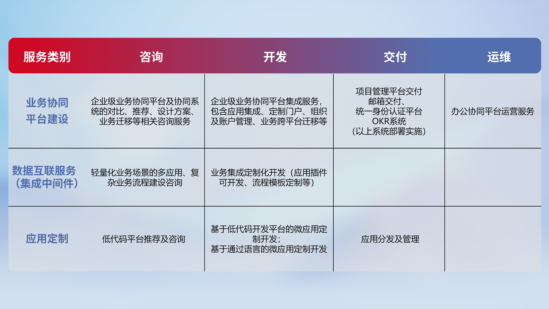 针对钉钉、、、企微、、、IDaas等平台级产品提供产品的规划、、、、方案、、交付、、、定制化开发等服务,,,,实现如统一协同办公、、智能客户服务、、、混合会议管理、、、智能数据查询、、、、等业务场景,,,实现数字化转型。。。。